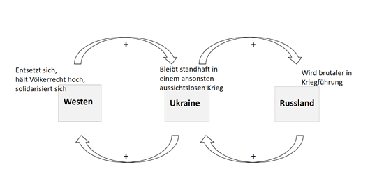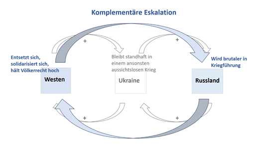 Die beiden befinden sich in einer komplementären Eskalation, vermittelt über die Ukraine, die sich wiederum mit Russland in einer klassischen symmetrischen Eskalation befindet. Die beiden Eskalationszirkel hängen in der Weise zusammen, dass durch die Solidarität des Westens der Kriegswille der Ukrainer viel länger aufrechterhalten werden kann, als er es angesichts eines aussichtslosen militärischen Kräfteverhältnisses sonst könnte, und dass dies die Intensität und Brutalität der russischen Kriegführung anheizt, was wiederum die Solidarität des Westens anheizt, usw.